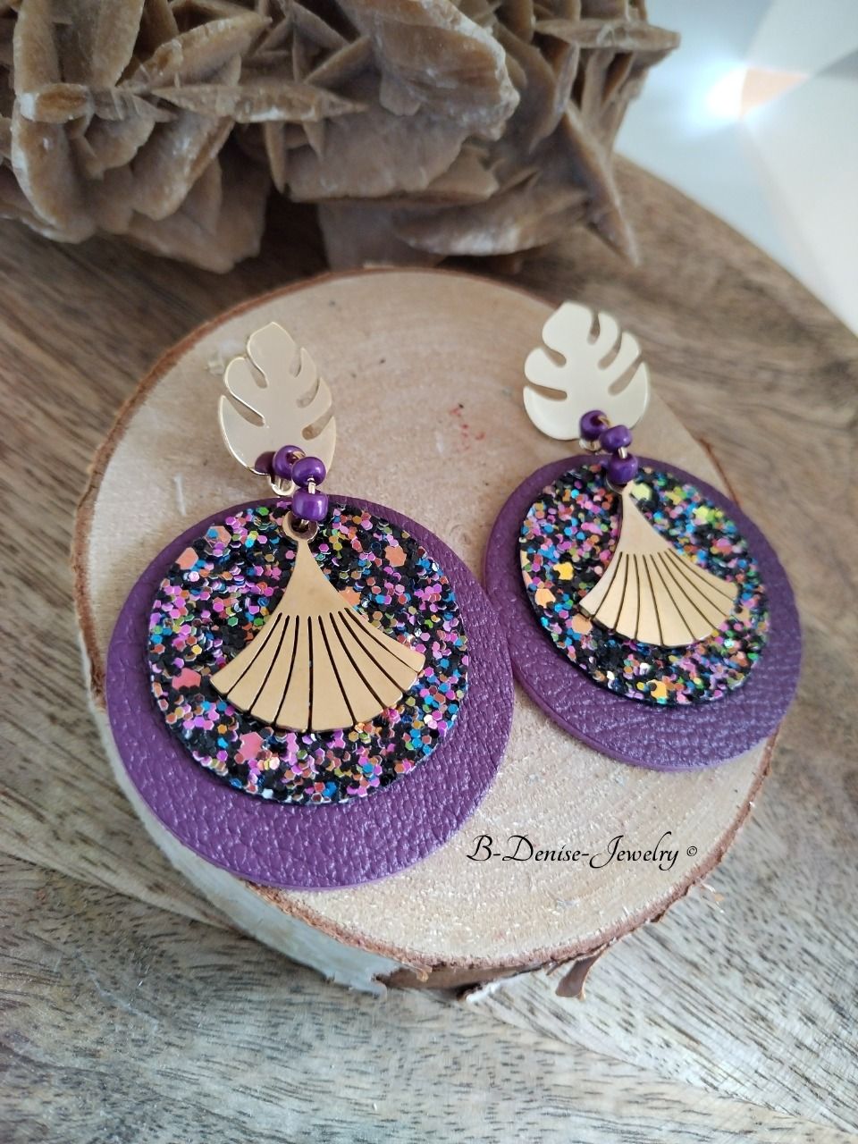 Boucles d'oreilles rond en cuir de chèvre, et Faux cuir paillettes Multi Puce Feuille de Monstera avec attache metal plaque Or Gold filled 18KT Pendentifs triangle en metal dore acier inoxydable Fait à la main avec soin, boucles d’oreilles Fabriqué en France Gap Hautes Alpes Paca